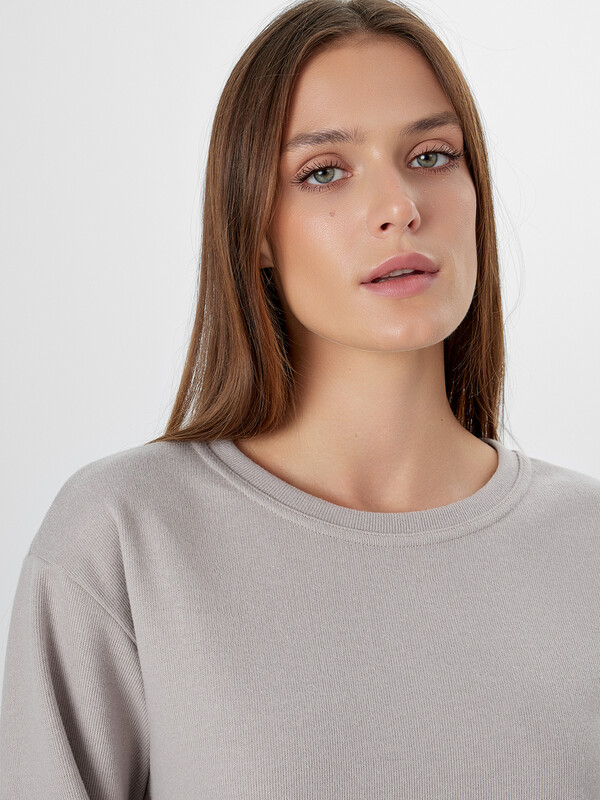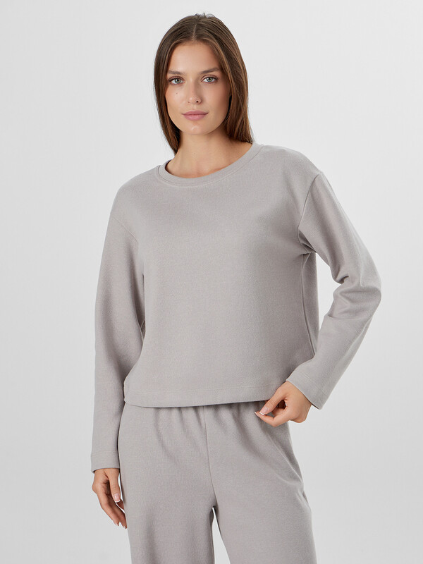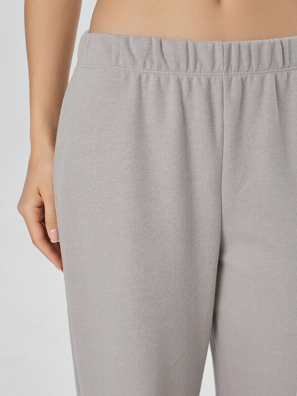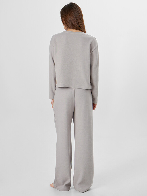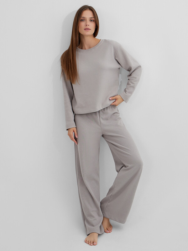 Комплект женский состоит из джемпера (502872) и брюк (532253). Джемпер домашний женский прямого силуэта. Горловина круглой формы, обтачка из основного полотна. Плечо слегка спущено. Рукав втачной, длинный. Нижний срез джемпера обработан швом вподгибку. Брюки с посадкой на талии, свободного силуэта. Пояс цельнокроеный с эластичной тесьмой внутри (внутр. 40мм 40RV). Нижний срез обработан швом в подгибку.