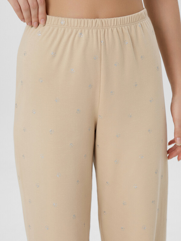 Джемпер свободного силуэта, чуть приталенный. Перед и спинка цельнокроеные. Горловина овальной формы, обработана в подгибку. Рукава втачные, длинные. Низ изделия и рукавов обработаны на микрооверлоке. Брюки свободного силуэта, с посадкой на талии. Пояс цельнокроеный с эластичной тесьмой внутри (внутр. 20мм 20 RV). Низ брюк обработан на микрооверлоке.