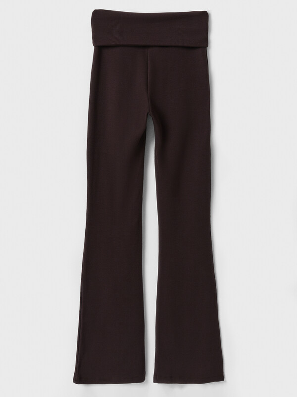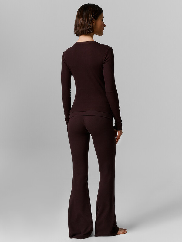Комплект состоит из джемпера и брюк. Джемпер прилегающего силуэта. Горловина круглой формы обработана обтачкой из основного полотна, шов втачивания обтачки по спинке закрыт бейкой из основного полотна. Рукава втачные длинные. Нижний срез джемпера и рукавов обработан швом вподгибку. Брюки клеш, посадка средняя. Пояс отрезной широкий с отворотом. По шву втачивания отворота в припуск вставлена эластичная тесьма 6мм (жилка тканая WT4-6 Arteks E7112). Нижний срез брюк обработан швом вподгибку.