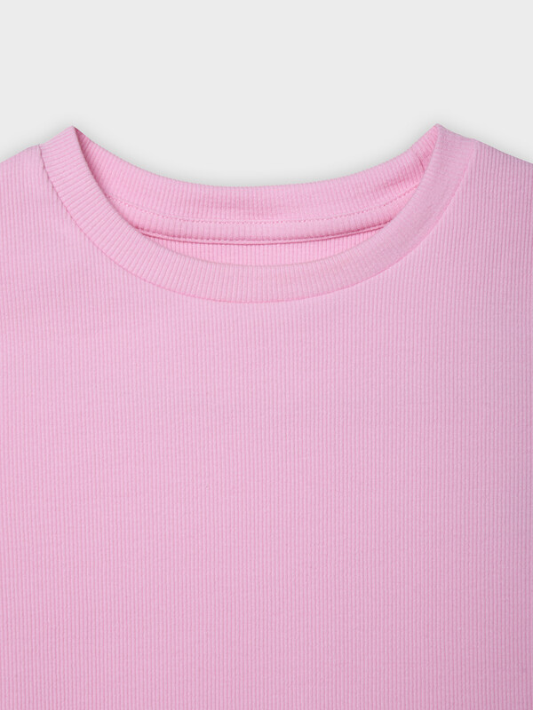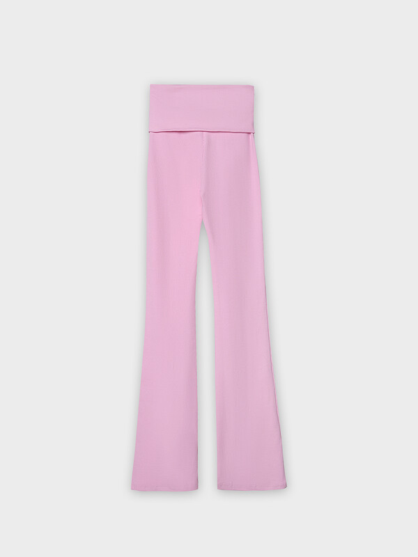 Комплект состоит из джемпера и брюк. Джемпер прилегающего силуэта. Горловина круглой формы обработана обтачкой из основного полотна, шов втачивания обтачки по спинке закрыт бейкой из основного полотна. Рукава втачные короткие. Нижний срез джемпера и рукавов обработан швом вподгибку. Брюки клеш, посадка средняя. Пояс отрезной широкий с отворотом. По шву втачивания отворота в припуск вставлена эластичная тесьма 6мм (жилка тканая WT4-6 Arteks E7112). Нижний срез брюк обработан швом вподгибку.