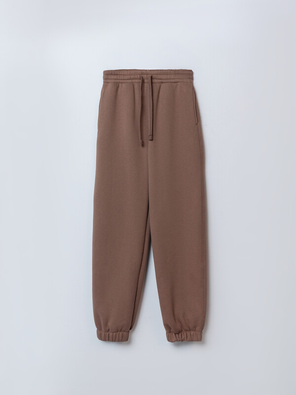 Джоггеры свободного кроя на мягком поясе со вставленной резинкой. Внутрь пояса продлен шнурок с узелками на концах, который можно затянуть по желанию. По бокам расположены удобные карманы. Низ штанин также обработан эластичной резинкой, что обеспечивает аккуратную посадку по длине.