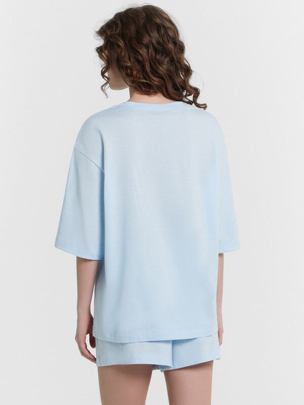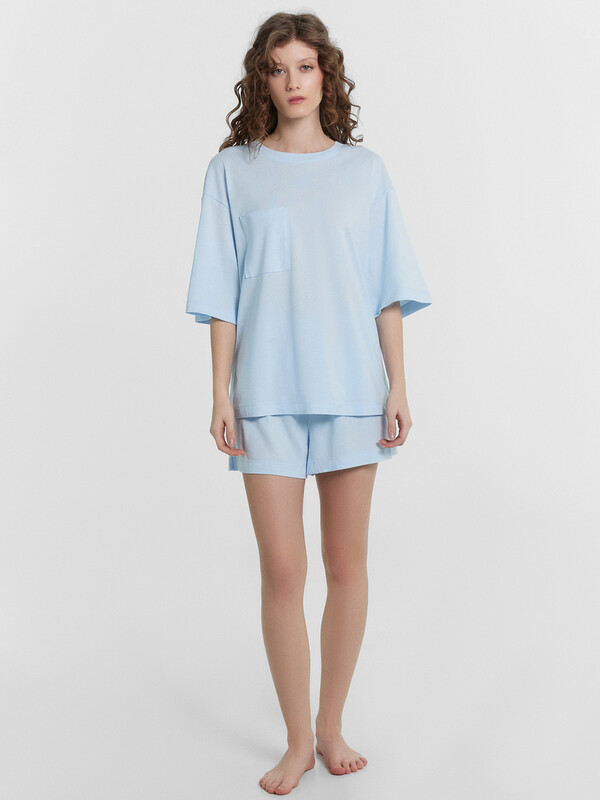 Женская пижама, выполненная из трикотажной кулирки, идеально сочетает в себе комфорт и стиль. Футболка свободного силуэта с круглой горловиной и спущенным плечом обеспечивает свободу движений, а углубленная пройма и широкие рукава длиной до локтя гарантируют дополнительное удобство. Шорты прямого силуэта с эластичным поясом гарантируют удобную посадку и комфорт при носке. Такой комплект подходит для сна, отдыха и домашних дел. Наслаждайтесь уютом и стилем в этой прекрасной пижаме!