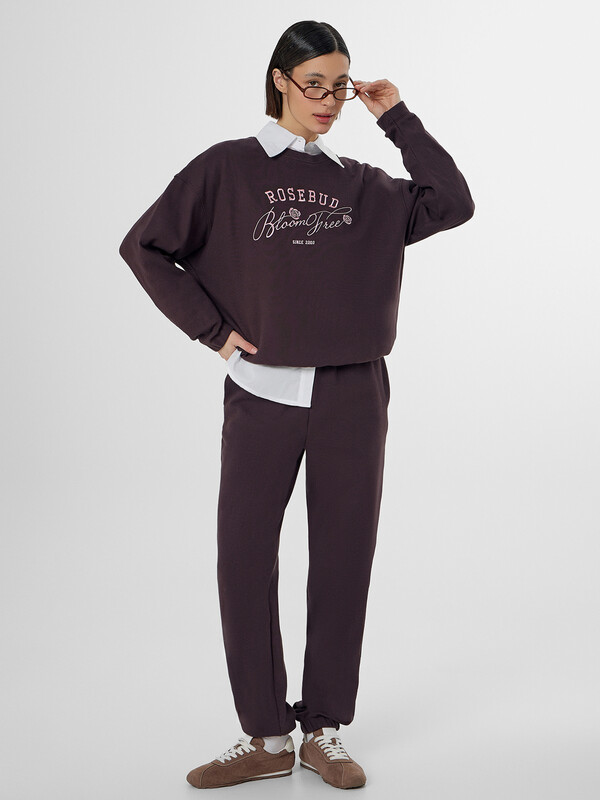Свитшот свободного кроя со спущенным плечом обеспечивает непринужденную посадку. Перед и спинка цельнокроеные, что создает гладкие линии без лишних боковых швов. Круглая горловина аккуратно обработана, а низ изделия и длинные рукава дополнены поясом и манжетами с широкой эластичной тесьмой для удобной фиксации.