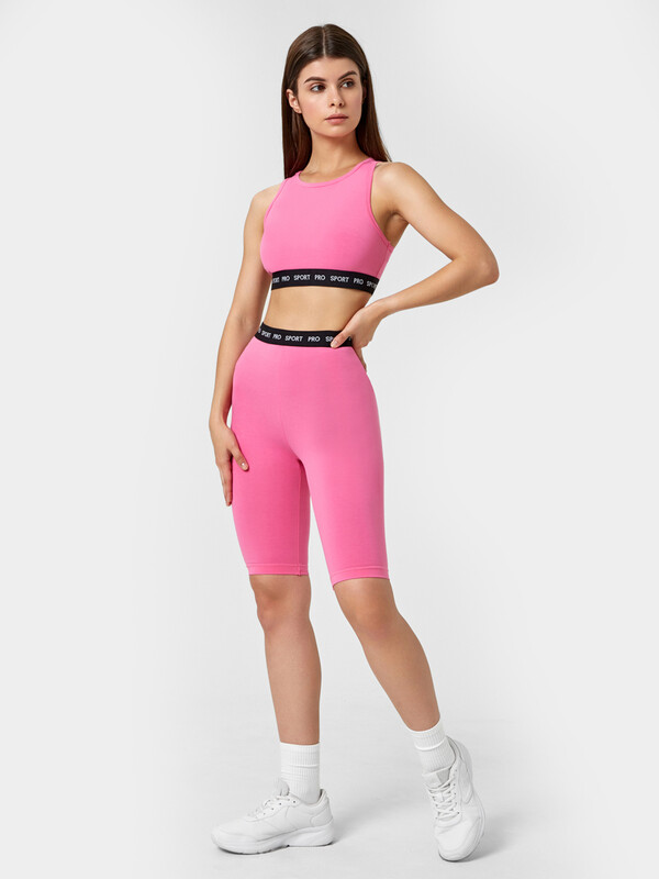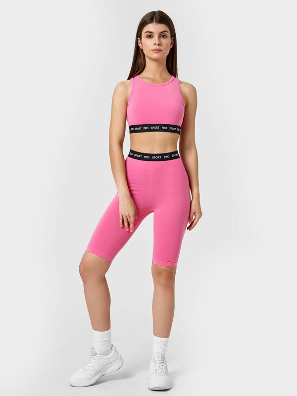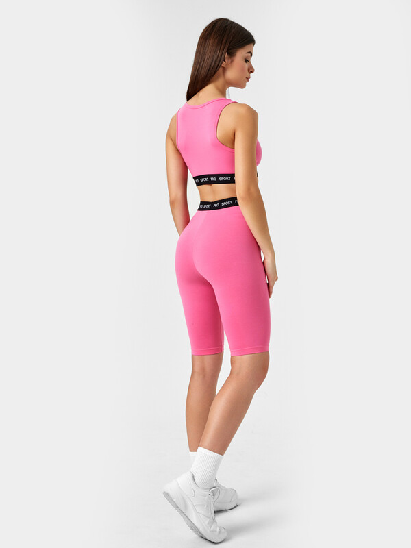 Удобный спортивный комплект из легкой трикотажной кулирки. Включает топ и шорты-велосипедки. Топ облегающего силуэта, с круглым вырезом горловины и «американской» проймой. Нижняя часть топа окантована жаккардовой эластичной тесьмой. Велосипедки облегающего силуэта, длиной до колен, с эластичной жаккардовой тесьмой в поясе. Стильно и функционально!