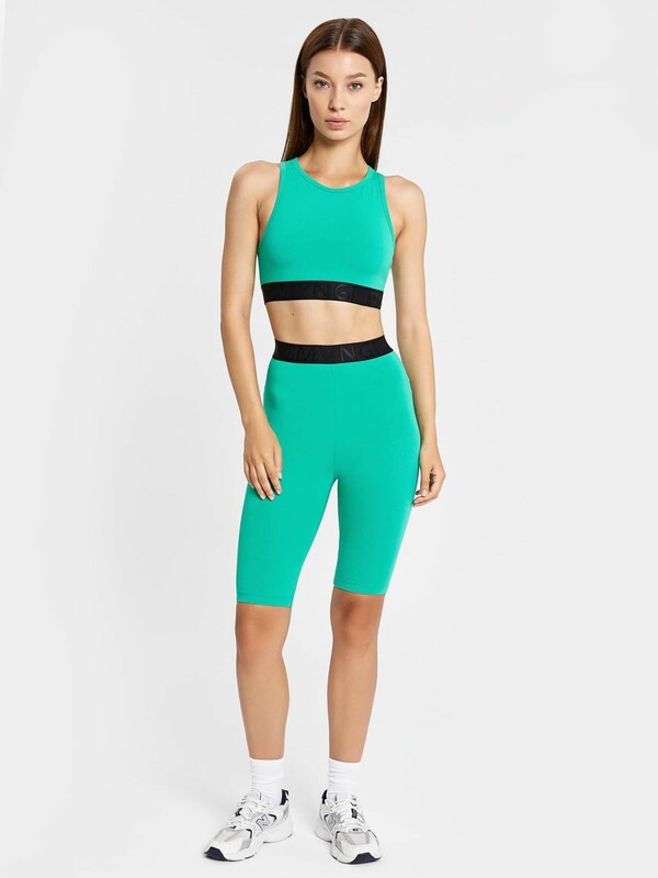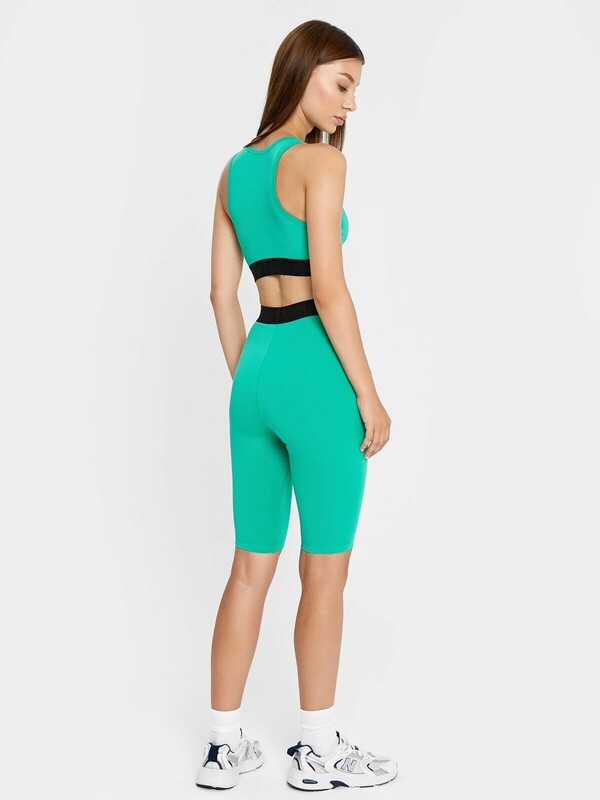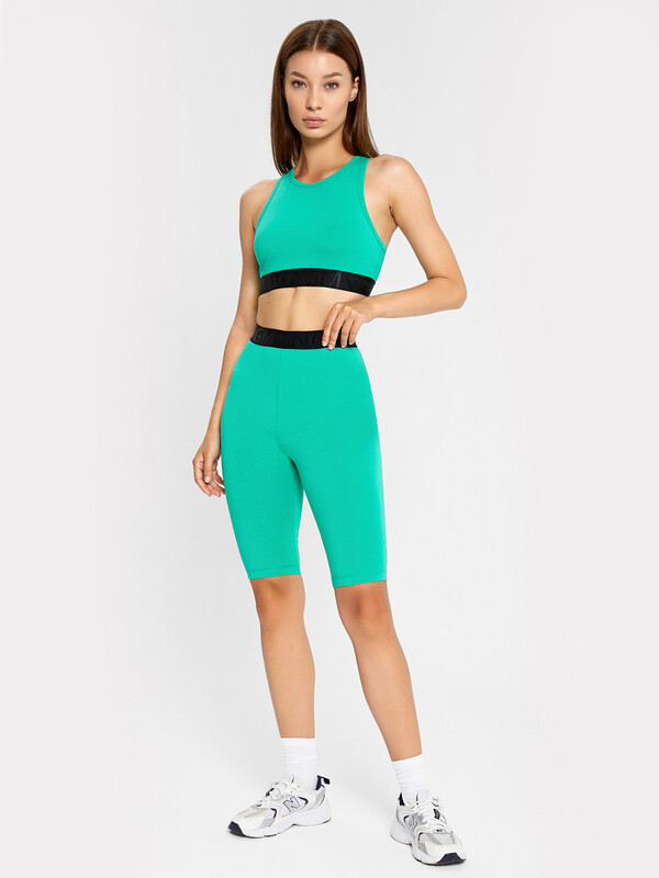 Удобный спортивный комплект из легкой трикотажной кулирки. Включает топ и шорты-велосипедки. Топ облегающего силуэта, с круглым вырезом горловины и «американской» проймой. Нижняя часть топа окантована жаккардовой эластичной тесьмой. Велосипедки облегающего силуэта, длиной до колен, с эластичной жаккардовой тесьмой в поясе. Стильно и функционально!