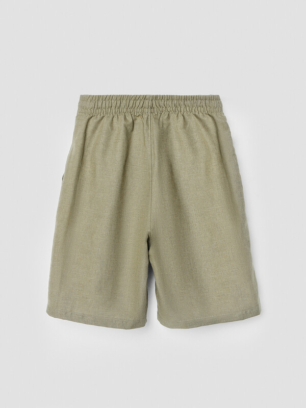 Комплект из двух предметов. Жакет прямого силуэта с воротником. По переду обработана застежка на пуговицы d=10mm и петли. Рукава короткие, втачные, слегка спущены. Нижние срезы изделия и рукавов обработаны швом в подгибку. Шорты прямого силуэта. Посадка средняя. Пояс цельнокроеный с эластичной тесьмой внутри. Шов сидения шорт распошит. На поясе пробиты петли, заправлен шнур из основного полотна. По переду имитация гульфика, обработаны карманы с наклонным входом от боковых швов. Низ шорт обработан швом в подгибку.