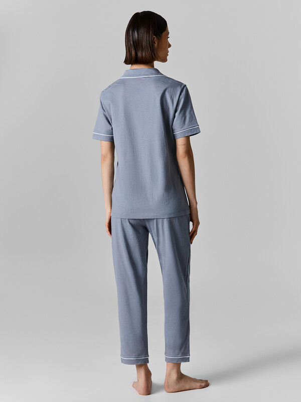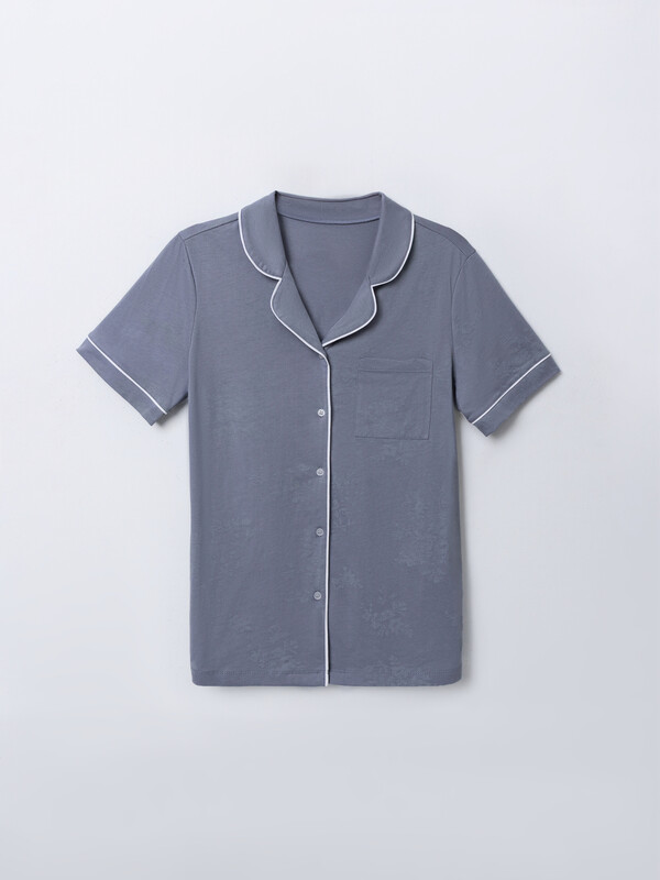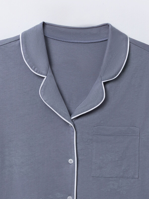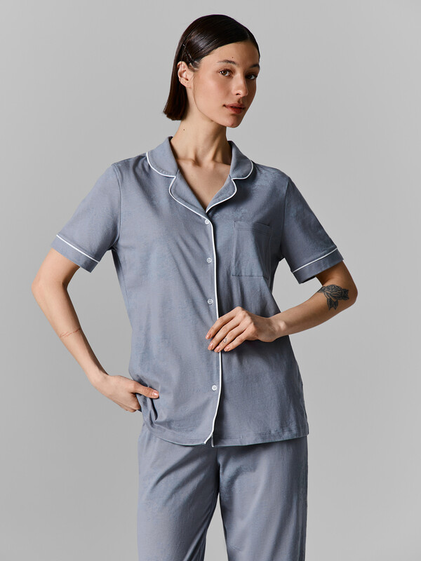Жакет выполнен в расслабленном крое с бесшовной спинкой для особой мягкости. Элегантный отложной воротник с расширяющимися краями подчеркивает линию шеи и дополнен контрастной окантовкой. На груди расположен накладной карман. Короткие рукава с манжетами и центральная застежка на пуговицах завершают образ.
