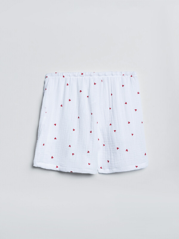 Шорты свободного силуэта, высокая посадка. Верх застрочен швом в подгибку с протянутым шнуром из основного полотна. В боковых швах карманы. Низ шорт обработан швом в подгибку.