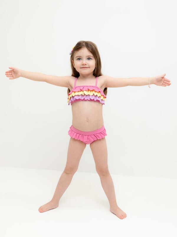 Раздельный купальник для девочки. Топ на регулируемых бретелях и плавки на эластичной резинке. Внутри подклад. Украшен воздушными оборками.