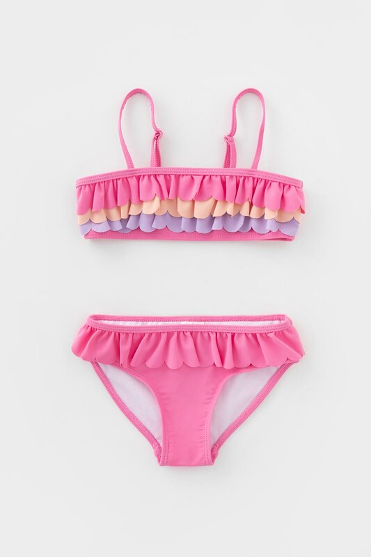 Раздельный купальник для девочки. Топ на эластичных бретелях. Плавки с оборкой на резинке. На груди и спинке воздушные оборки.