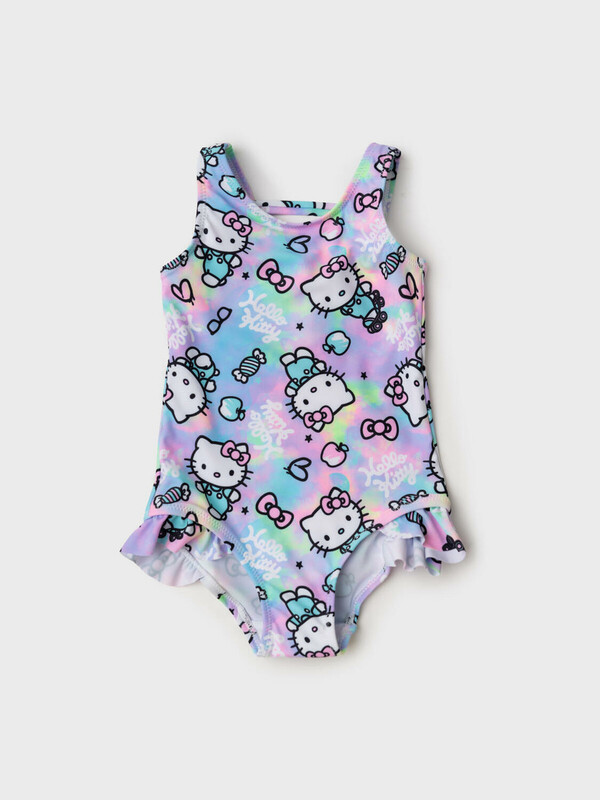 Детский слитный купальник для девочки с ярким принтом Hello Kitty. Модель с открытой спинкой, круглым вырезом спереди и воланами по бокам на бедрах. Вырезы обработаны мягкой эластичной резинкой, обеспечивающей комфортную посадку. Основной фон — радужный, с изображением Hello Kitty, бантиков, сердечек и конфет в розово-мятной гамме. Внутри передняя часть с подкладкой. Благодаря UF-защите, ткань сохраняет первоначальный вид даже при длительном пребывании на солнце. Подходит для плавания и активного отдыха.