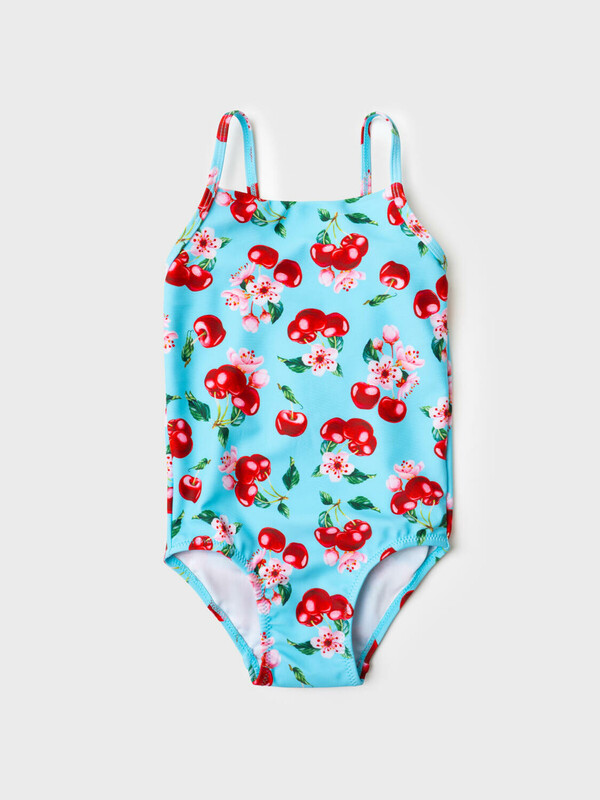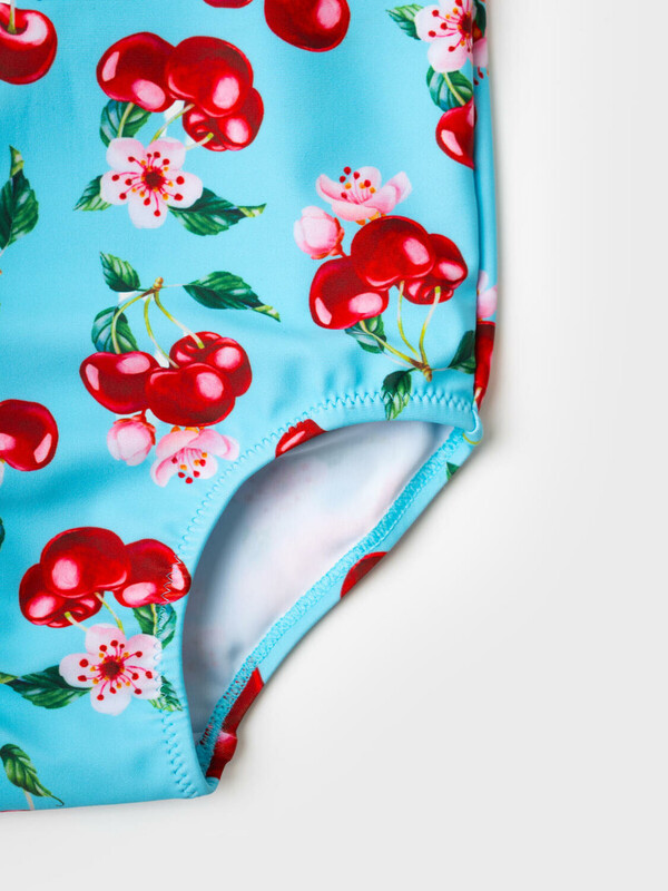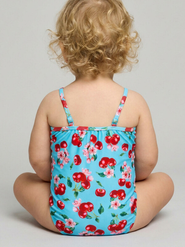 Слитный детский купальник для девочки. Модель с насыщенным летним принтом: на голубом фоне изображены крупные вишни, листья и цветы. Передняя часть с высоким вырезом, спинка открытая с эластичной сборкой. Удобные тонкие бретели перекрещиваются сзади и регулируются по длине. Внутри предусмотрена подкладка на передней части, низ изделия мягко обработан резинкой. Благодаря UF-защите, ткань сохраняет первоначальный вид даже при длительном пребывании на солнце. Подходит для пляжа и бассейна.