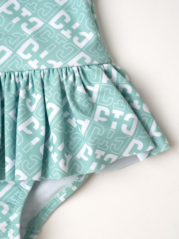 Слитный детский купальник для девочки. Модель выполнена в светло-зелёном цвете с белым геометрическим рисунком. Купальник украшен юбочкой-оборкой по линии талии, которая создаёт эффект платья. На спинке — декоративный силиконовый шеврон. Проймы и горловина мягко обработаны эластичной резинкой, обеспечивая комфорт и хорошую посадку. В нижней части — вставка из подкладки и защитная наклейка для примерки. Благодаря UF-защите, ткань сохраняет первоначальный вид даже при длительном пребывании на солнце. Подходит для плавания и активного отдыха.