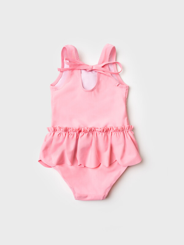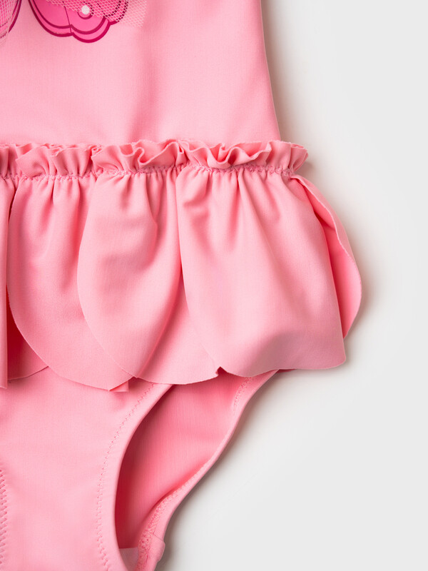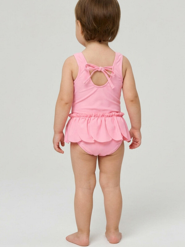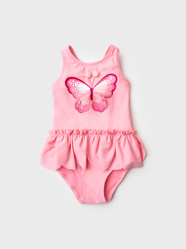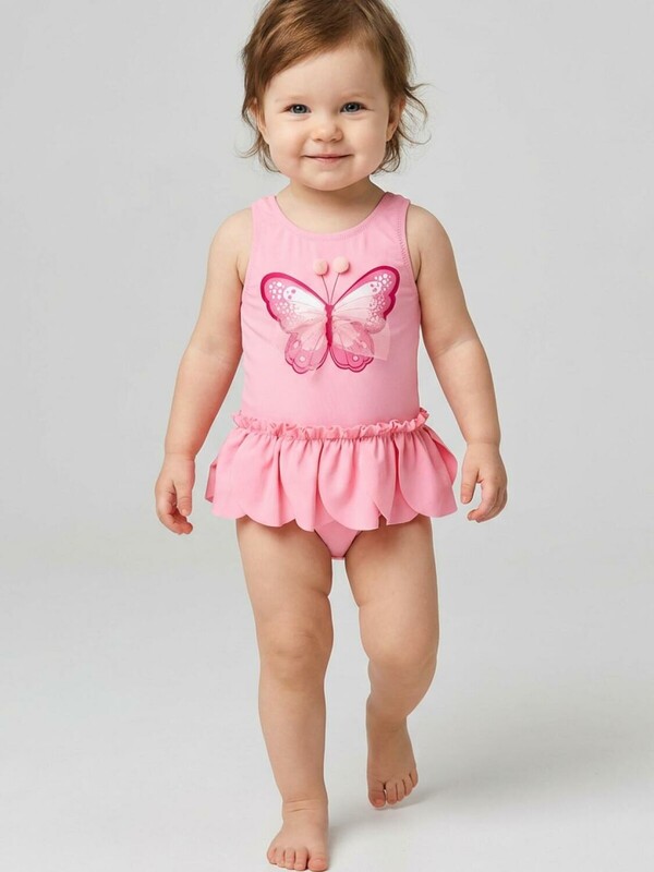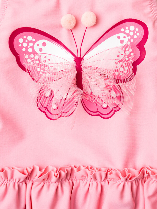 Детский слитный купальник для девочки. Выполнен в светло-розовом цвете с ярким принтом в виде бабочки. Украшен объёмными деталями и блёстками, что делает образ нарядным. По талии пришита декоративная юбочка из лепестков, создающая эффект воздушности. На спинке – контрастная вставка с милым бантиком. Все края обработаны эластичной тесьмой, чтобы изделие хорошо сидело на теле и не натирало. Благодаря UF-защите, ткань сохраняет первоначальный вид даже при длительном пребывании на солнце. Подходит для плавания и активного отдыха.