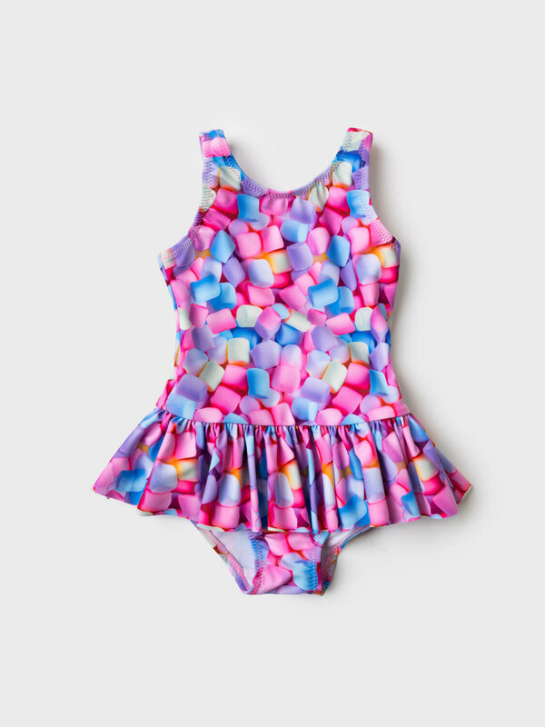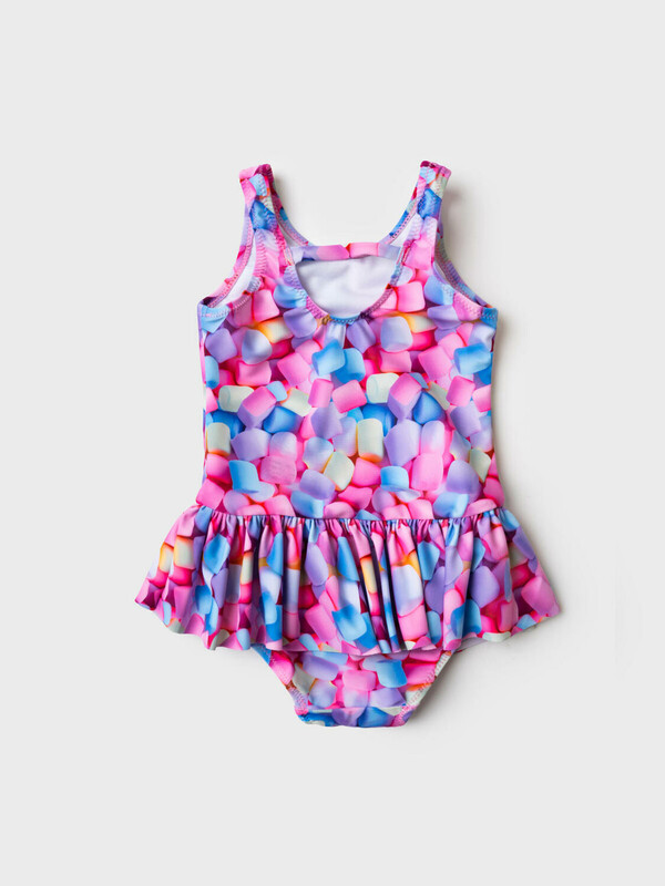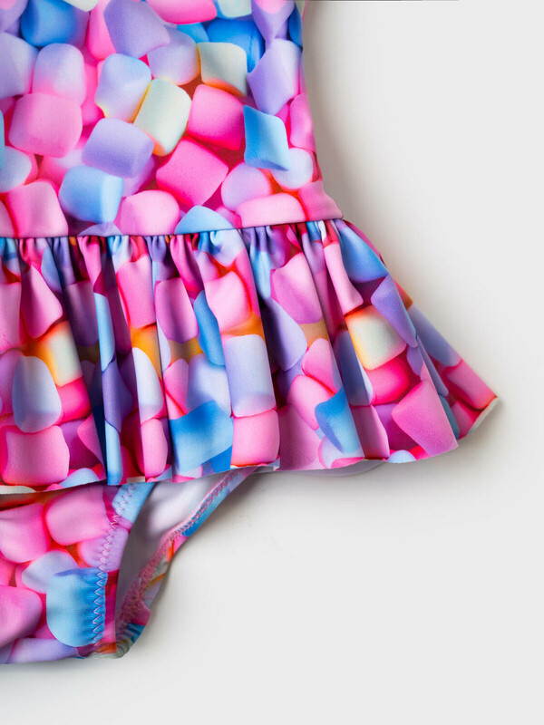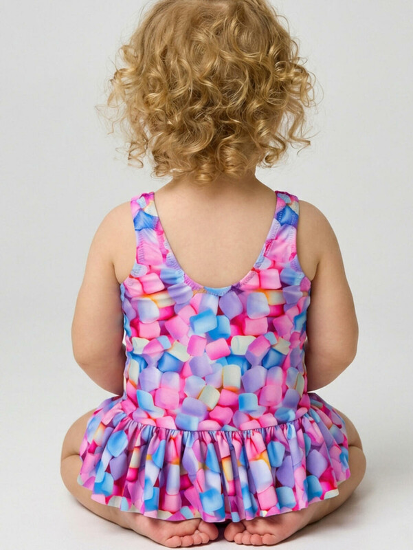 Детский слитный купальник для девочки. Выполнен в ярком и веселом дизайне с принтом зефирок в пастельных оттенках. Внутри - подкладка. Модель с юбочкой по талии, которая придает изделию праздничный и милый вид. Спереди — классический круглый вырез, а на спинке — глубокий вырез с двумя декоративными перемычками. Все края обработаны эластичной тесьмой, чтобы изделие хорошо сидело на теле и не натирало. Благодаря UF-защите, ткань сохраняет первоначальный вид даже при длительном пребывании на солнце. Подходит для плавания и активного отдыха.