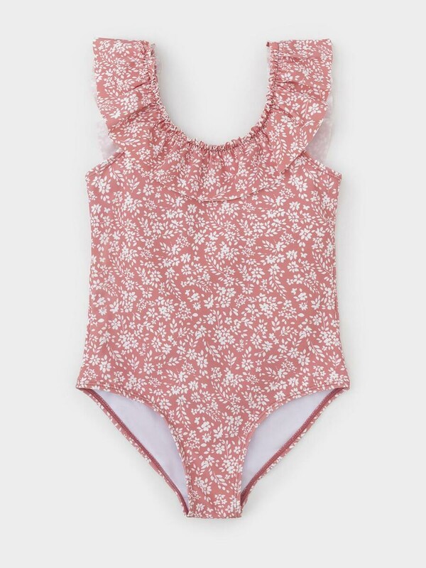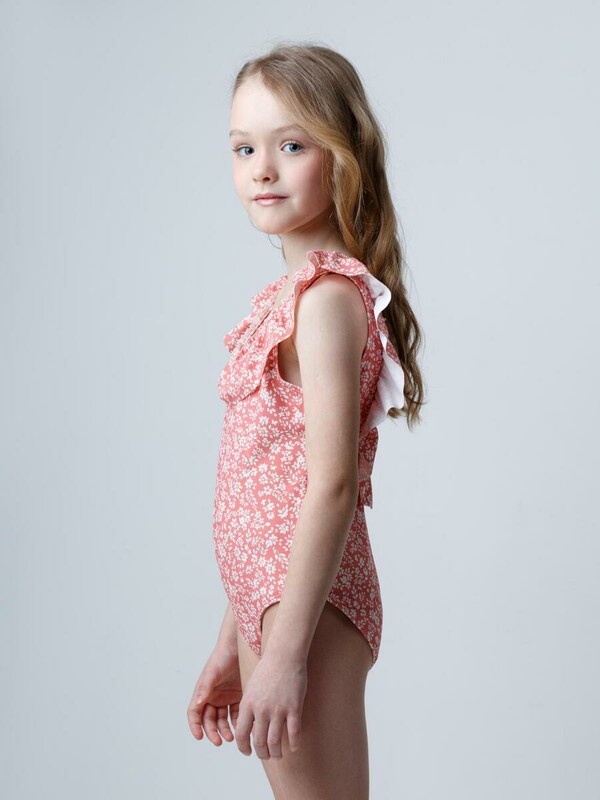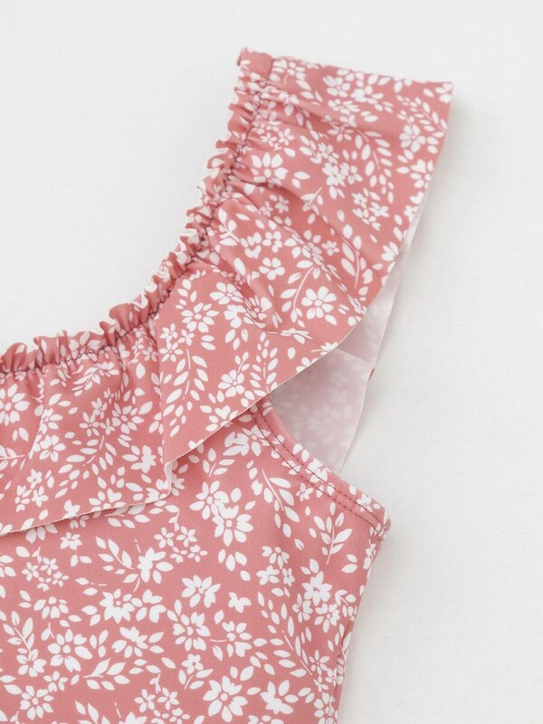 Слитный купальник на лямках для девочки. Украшен оборками. Внутри подклад. Оригинальная набивка выполнена из стойких гипоаллергенных красителей.