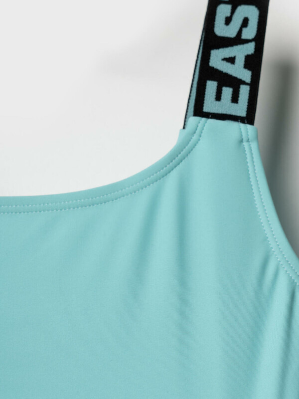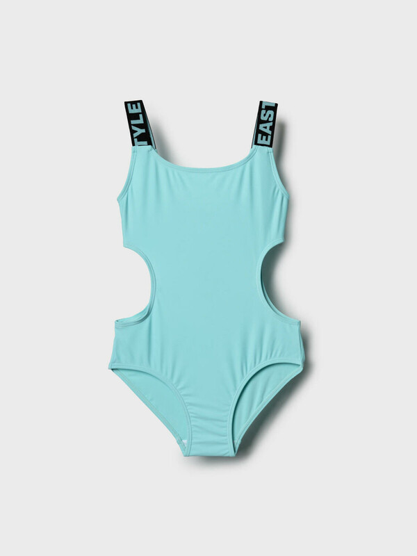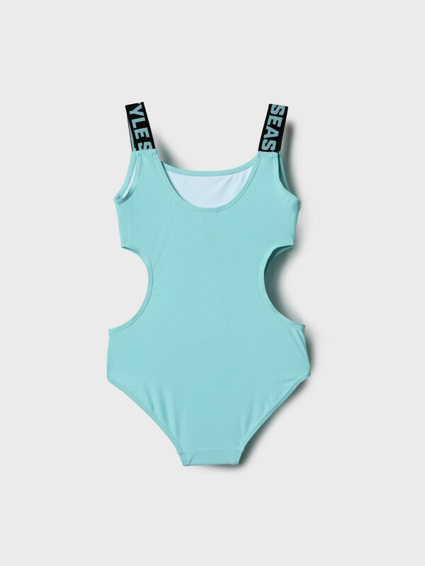 Слитный купальник для девочки подростка. Модель выполнена в модном дизайне с фигурными вырезами по бокам и глубоким овальным вырезом на спинке. Бретели украшены жаккардовой тесьмой с надписями. Купальник пошит из эластичного мятного трикотажа с белой подкладкой. Внутри — съёмные чашки и гигиеническая вставка. Все срезы обработаны мягкой эластичной лентой для комфортной посадки. Благодаря UF-защите, ткань сохраняет первоначальный вид даже при длительном пребывании на солнце. Подходит для плавания и активного отдыха.