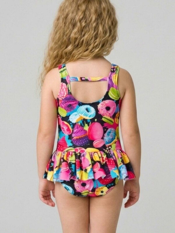 Яркий детский слитный купальник для девочки. Модель с удобными широкими бретелями и декоративной оборкой на талии. На спинке — красивый глубокий вырез с резинкой. Весь купальник украшен красочным принтом с изображением сладостей — капкейков, макаронов и пончиков на черном фоне. Обработка выполнена мягкой резинкой, внутри есть подкладка и гигиеническая наклейка. Подходит для пляжа и бассейна.