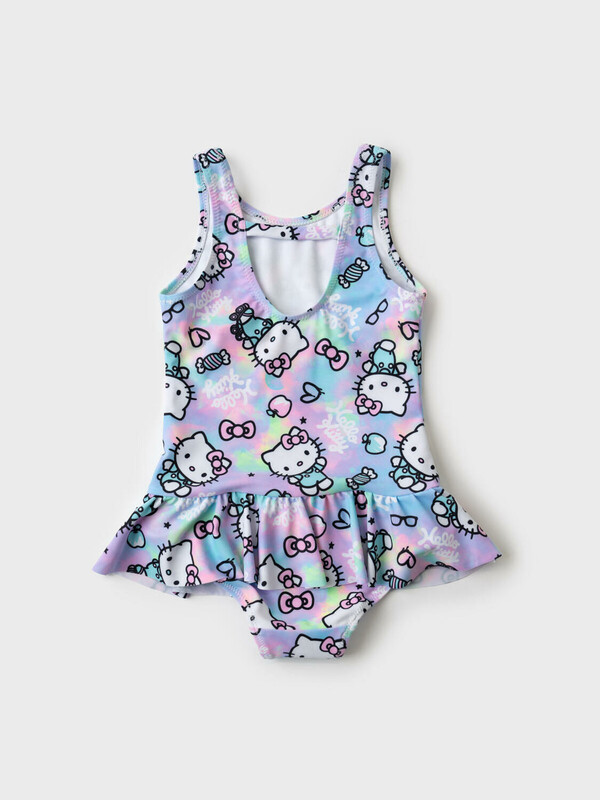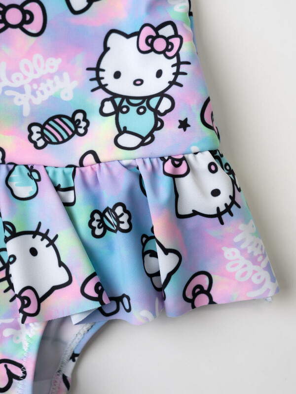 Cлитный детский купальник с ярким дизайном Hello Kitty для девочки. Купальник выполнен в пастельных оттенках с принтом, где изображены Hello Kitty, конфетки, бантики и надписи. По линии талии — декоративная юбочка, которая делает образ ещё более нежным. У купальника открытая спинка с эластичной полоской. Внутри — подкладка. Все края обработаны эластичной тесьмой, чтобы изделие хорошо сидело на теле и не натирало. Благодаря UF-защите, ткань сохраняет первоначальный вид даже при длительном пребывании на солнце. Подходит для плавания и активного отдыха.