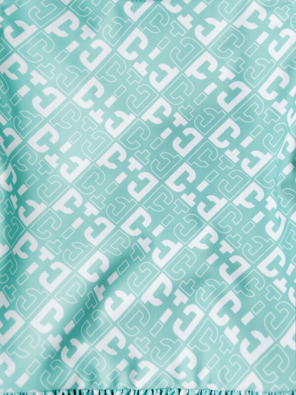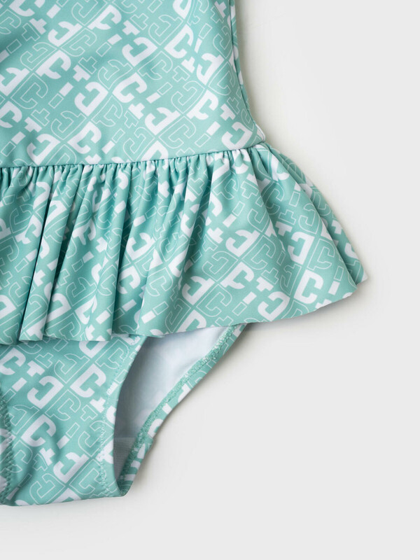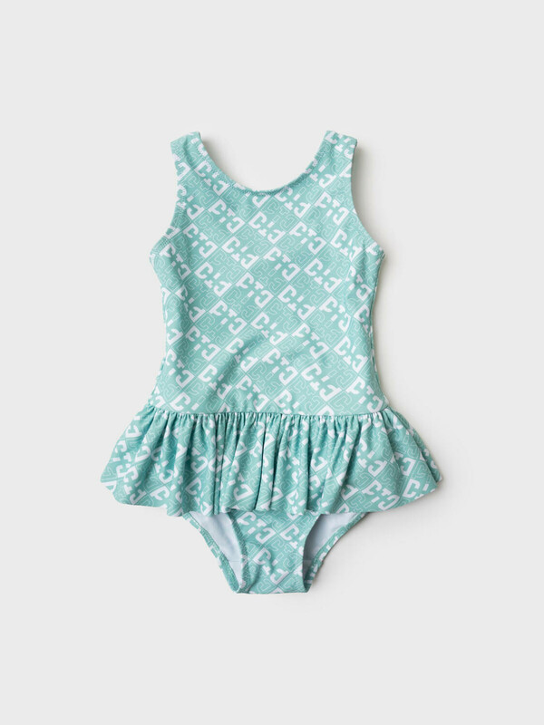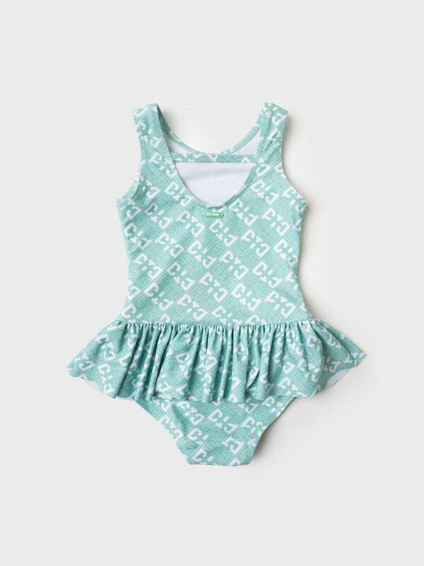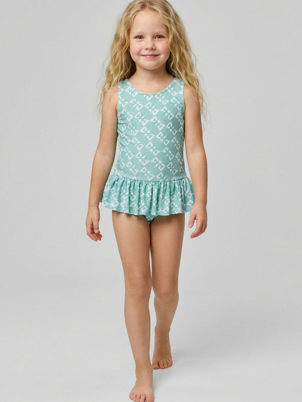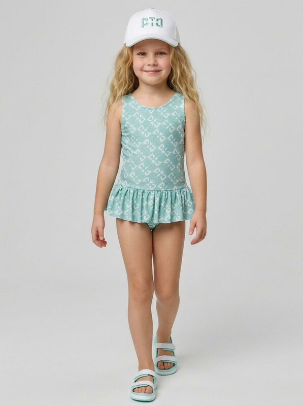 Слитный детский купальник для девочки. Выполнен из эластичного материала с ярким светло-зелёным принтом в виде ромбов и логотипов. Модель с широкой оборкой по талии, которая придаёт образу лёгкости. Спереди – классический круглый вырез, а на спинке – глубокий овальный вырез с декоративной вставкой между бретелями. Все края обработаны эластичной тесьмой, чтобы изделие хорошо сидело на теле и не натирало. Благодаря UF-защите, ткань сохраняет первоначальный вид даже при длительном пребывании на солнце. Подходит для плавания и активного отдыха.