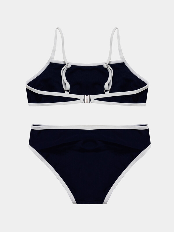 Трикотажное эластичное полотно. Трикотажное полотно, подкладка для купальников. Передняя и задняя детали топа, передняя и задняя детали трусов цельнокроенные. Подкладка передней детали топа и подкладка ластовицы, передней детали трусов из трикотажного полотна. Верхние и нижние срезы трусов и топа обработаны бейкой из основного полотна. По спинке топа застежка. Бретели из основного полотна с надставками, регулируются по длине сзади.