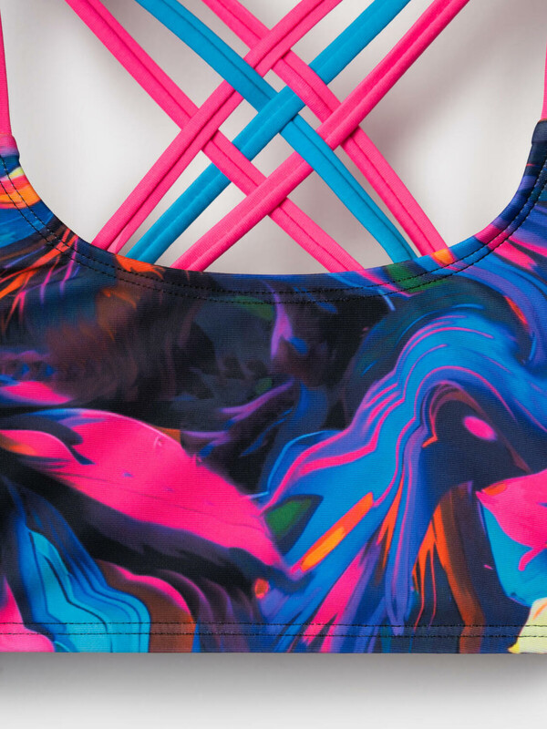 Купальник для девочки подростка. Верх выполнен без застёжек, с удобной посадкой и эффектными перекрещивающимися бретелями в контрастных цветах: розовом и бирюзовом. Вся поверхность изделия покрыта красочным абстрактным принтом с переходами насыщенных цветов – от фуксии до бирюзы и синего. Костюм выполнен из эластичного трикотажа с подкладкой в нижней части и усилен силиконовой лентой по краям, чтобы хорошо держал форму. Благодаря UF-защите, ткань сохраняет первоначальный вид даже при длительном пребывании на солнце. Благодаря мягким швам и комфортной посадке изделие подойдёт для активного отдыха и плавания.