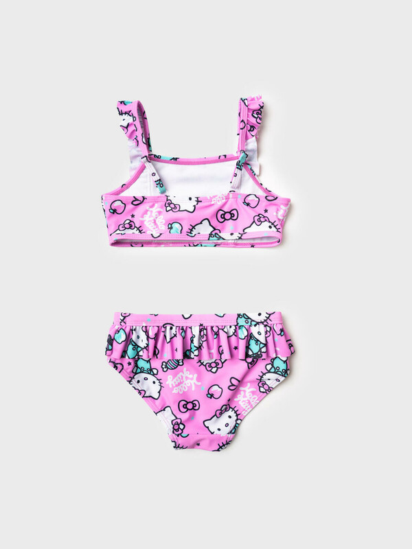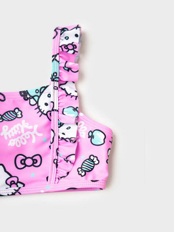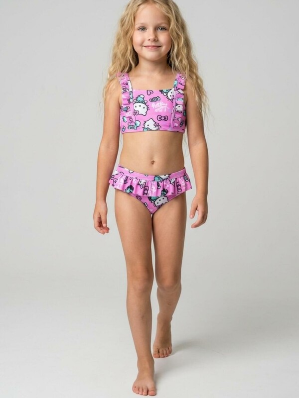 Купальник детский раздельный для девочки. Модель с принтом Hello Kitty с конфетами и бантиками. Топ с прямым вырезом и декоративными воланами на лямках, которые регулируются по длине. Плавки украшены воланом по поясу. Внутри предусмотрена подкладка, а по краям изделия использованы эластичные резинки для удобной посадки. Благодаря UF-защите, ткань сохраняет первоначальный вид даже при длительном пребывании на солнце. Подходит для плавания и активного отдыха.