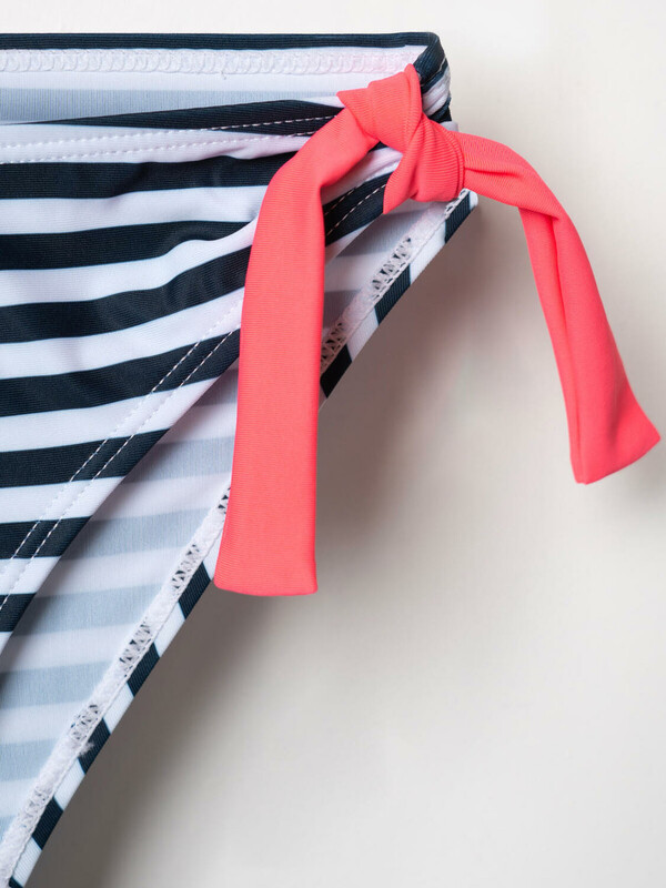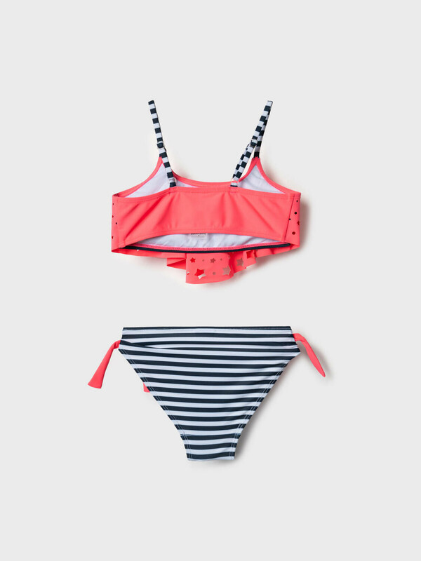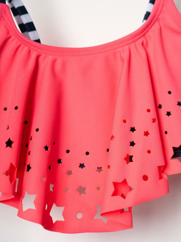 Раздельный купальник для девочки подростка. Верх — топ на тонких регулируемых бретелях с воланом из розовой ткани, украшенным вырезами в виде звёзд. Низ — классические плавки в тёмно-синюю и белую полоску, с розовыми завязками по бокам. Модель выполнена из эластичной ткани с мягкой подкладкой внутри для комфорта. Благодаря UF-защите, ткань сохраняет первоначальный вид даже при длительном пребывании на солнце. Подходит для плавания и активного отдыха.