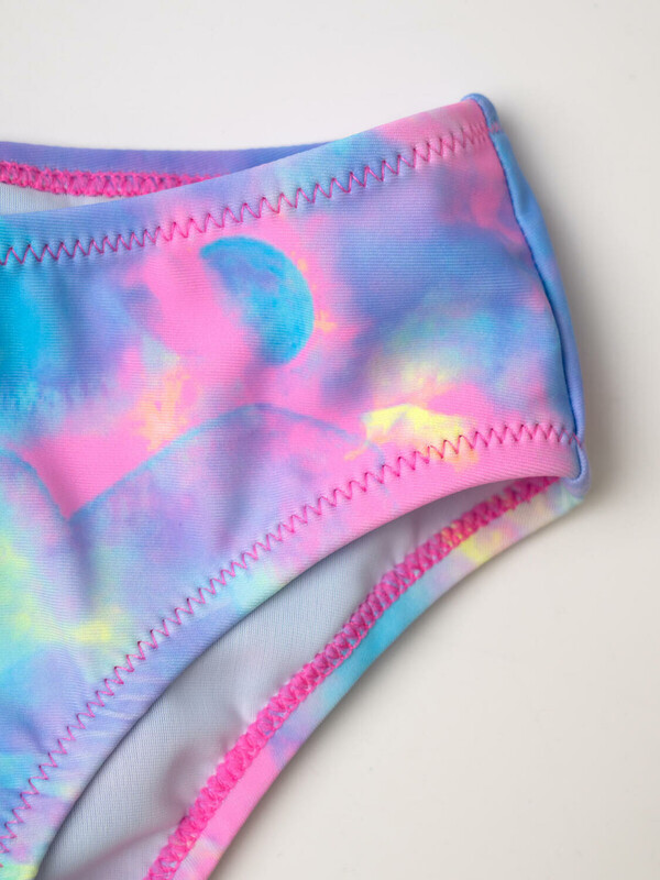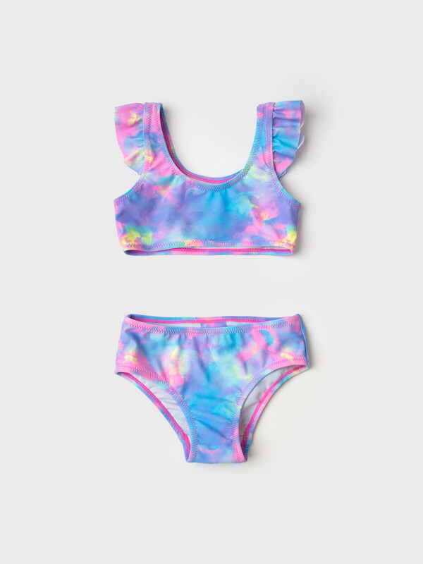 Купальник раздельный для девочки. Верхняя часть — это укороченный топ на широких бретелях с пышными крылышками. Низ — плавки с удобной посадкой. Все края обработаны эластичной тесьмой, чтобы изделие хорошо сидело на теле и не натирало. Благодаря UF-защите, ткань сохраняет первоначальный вид даже при длительном пребывании на солнце. Подходит для плавания и активного отдыха.