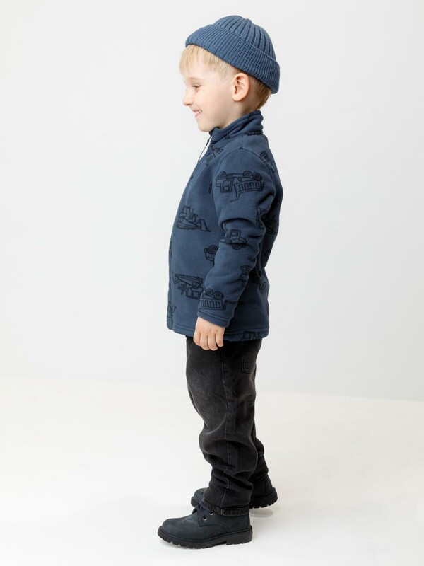 Флисовая куртка для мальчика. У изделия высокий воротник и застёжка на молнию с мягкой защитой шеи и подбородка. По бокам два кармана. Оригинальная набивка выполнена из стойких гипоаллергенных текстильных красителей. Куртка сохраняет цвет и форму после многократных стирок.