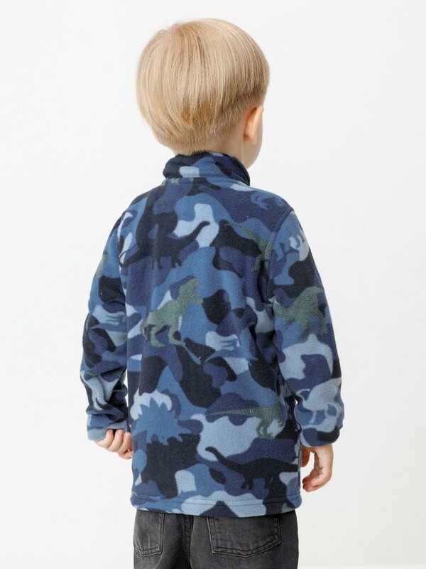 Флисовая куртка для мальчика. У изделия высокий воротник и застёжка на молнию с мягкой защитой шеи и подбородка. По бокам два кармана. Оригинальная набивка выполнена из стойких гипоаллергенных текстильных красителей. Куртка сохраняет цвет и форму после многократных стирок.