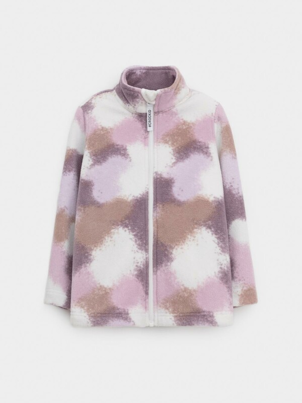 Флисовая куртка для девочки. У изделия высокий воротник и застёжка на молнию с мягкой защитой шеи и подбородка. По бокам два кармана. Оригинальная набивка выполнена из стойких гипоаллергенных текстильных красителей. Куртка сохраняет цвет и форму после многократных стирок.