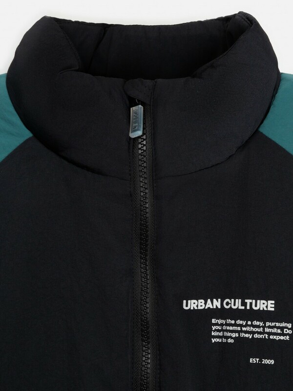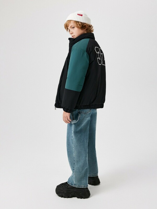 Детская утеплённая стеганая куртка для мальчика выполнена из водонепроницаемой ткани с жатым эффектом, который придает модели визуального интереса. Куртка колор-блок утеплена синтепоном (вес — 250 г/м2), что делает комфортным ношение при температуре от +10 до -10 градусов. Подкладка выполнена из стандартной подкладочной ткани. Спереди расположена центральная застёжка на молнию с внутренней ветрозащитной планкой и защитой от защемления подбородка. Короткий воротник-стойка закрывает горло и избавляет от необходимости носить шарф. Низ изделия и рукавов с эластичной лентой, обеспечивающей плотное прилегание к телу и предотвращение продувания. Спереди расположены два кармана, в которых можно хранить перчатки или греть руки. На спинке расположен принт с номером спортивного игрока, а на груди надпись "URBAN CULTURE | ENJOY THE DAY A DAY, PURSUING YOU DREAMS WITHOUT LIMITS. DO KIND THINGS THEY DON'T EXPECT YOU TO DO | EST 2009" англ. - "Уличная культура | Наслаждайся каждым днем, преследуя свои мечты без ограничений. Делай добрые дела, которых от тебя не ждут| с 2009 года". Расцветка в стиле колор-блок делает модель уникальной и неповторимой. Куртка представлена в двух цветах: черно-бежевом и черно-зеленом.