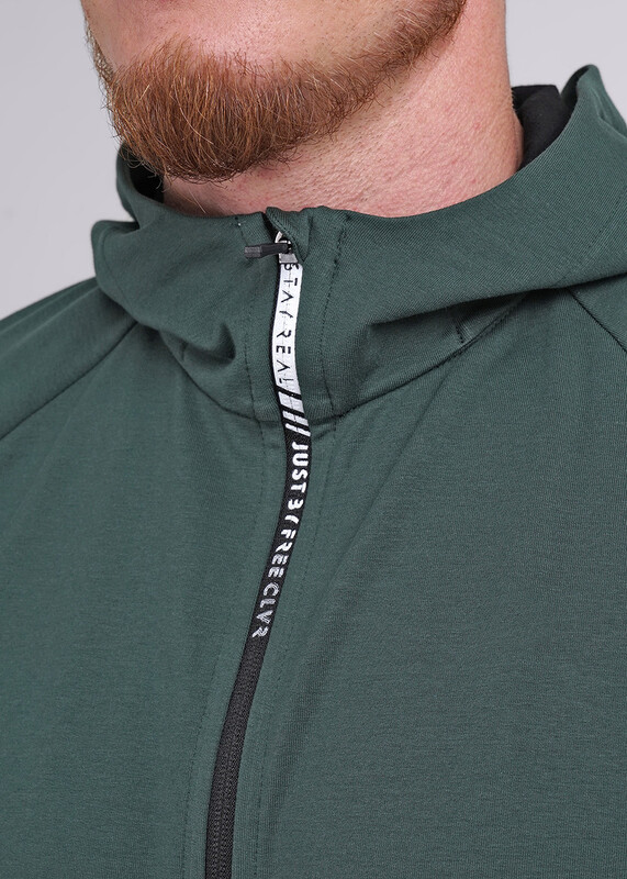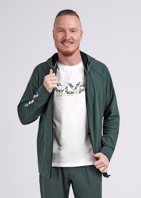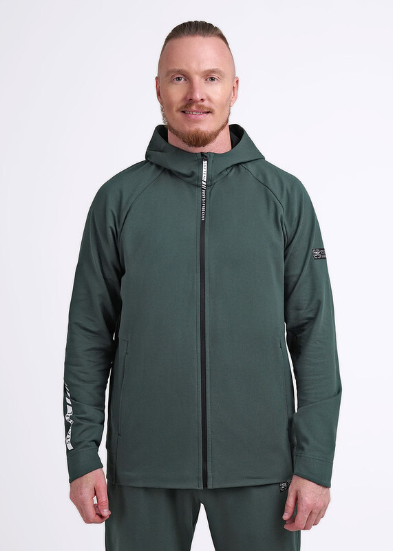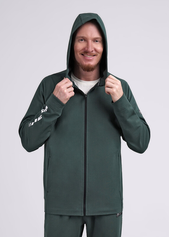 Мужская куртка из футера на молнии. Изделие дополнено 2-мя вместительными карманами на молнии, имиджевой фурнитурой и дизайнерским принтом. Комфортный и практичный вариант для активных мужчин.