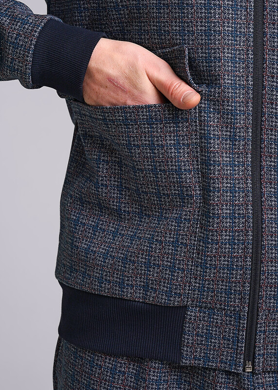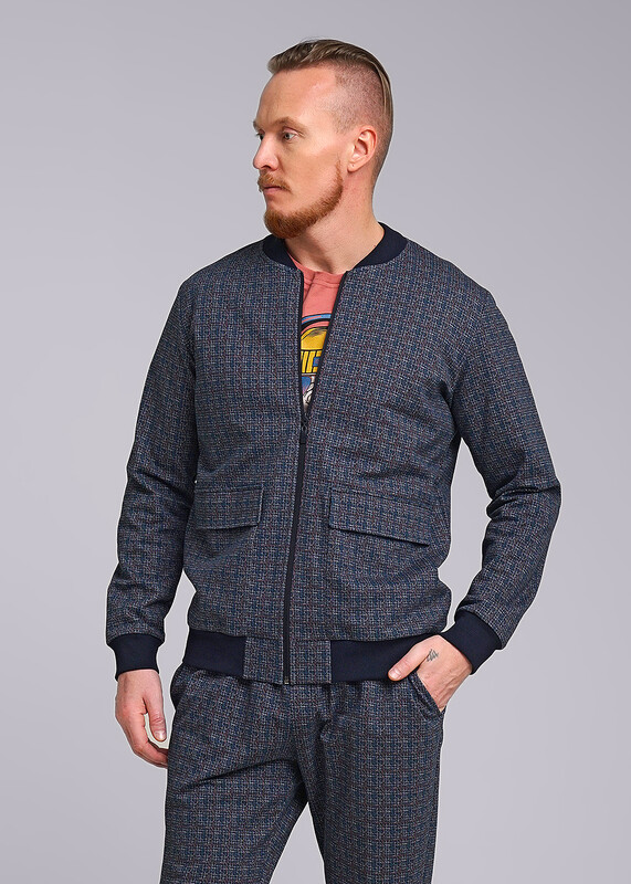 Мужской бомбер на молнии из трикотажного полотна футер в клетку. Накладные карманы, эластичные манжеты и пояс добавляют удобства в носке. Бомбер в стиле casual составит отличный комплект к брюкам и футболке.