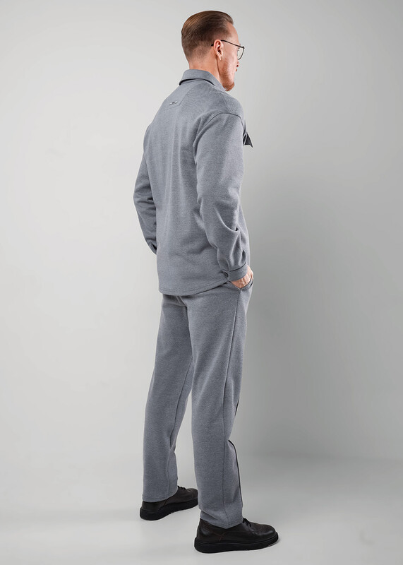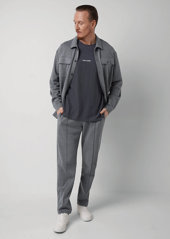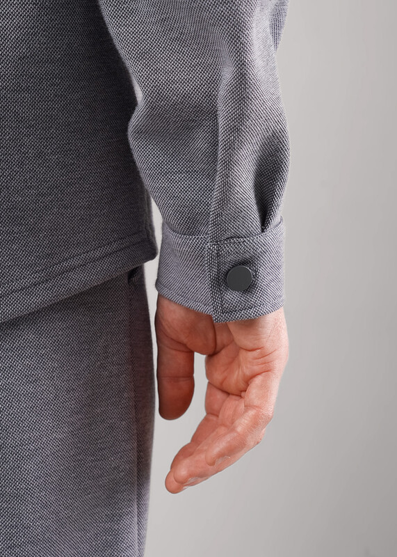 Мужская куртка-рубашка выполнена из фактурного трикотажного полотна, свободного силуэта с отложным воротником и застежкой на пуговицы. Модель дополнена нагрудными карманами. По низу рукава манжета. Отлично подойдет для работы и учебы.