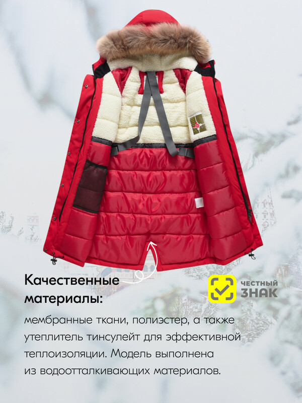 - Съемная меховая опушка: Из натурального меха енота, добавляет стильный акцент и дополнительное тепло.