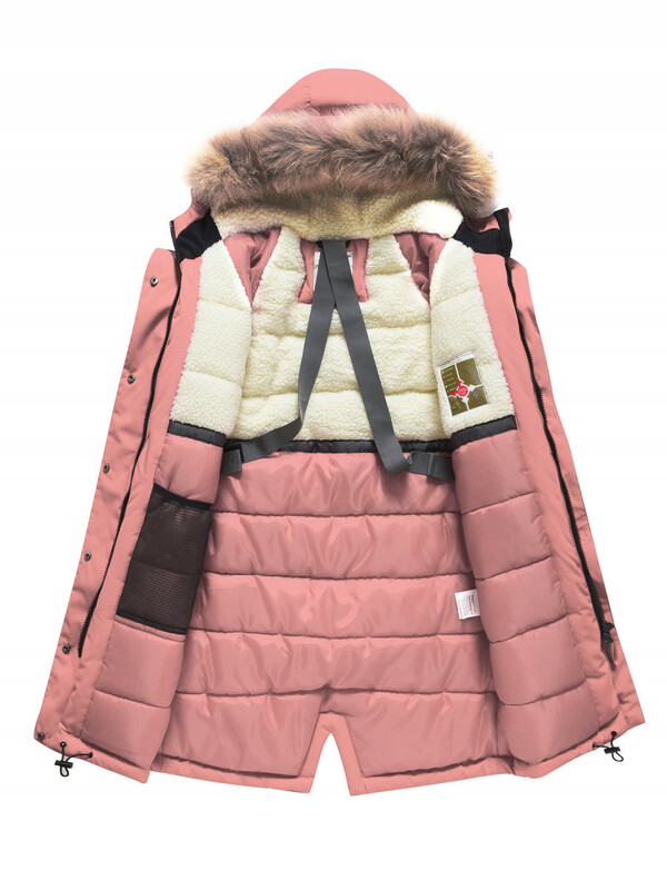 - Съемная меховая опушка: Из натурального меха енота, добавляет стильный акцент и дополнительное тепло.