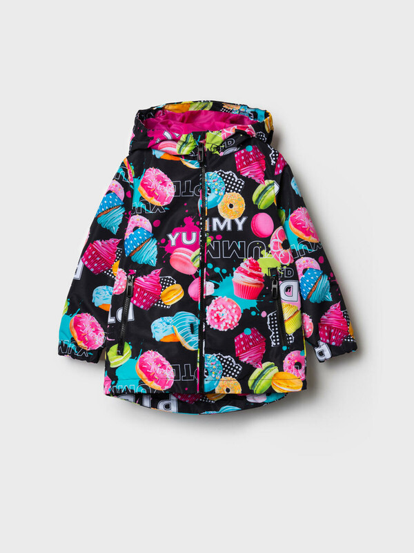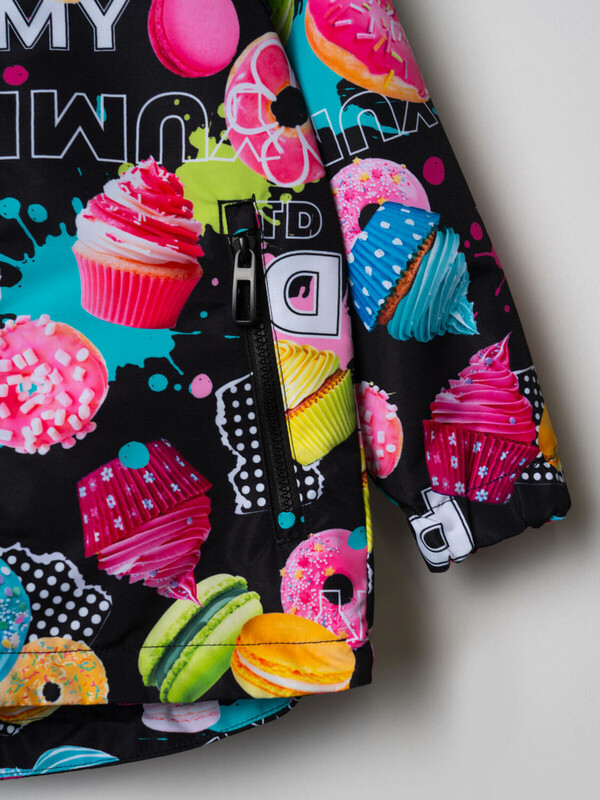 Ветровка детская для девочки. Температурный режим от +20С до +10С. Ткань с мембранным покрытием 5000х5000. Внутри флисовая подкладка. Яркий и запоминающийся принт с пирожными, пончиками и макарунами делает изделие очень привлекательным. Капюшон несъемный на резинке. Боковы карманы на молнии. Внутренний карман на липучке. Рукава на резинке. По низу изделия утяжка со стопперами. Сзади и на рукаве — светоотражающие элементы для безопасности в тёмное время суток.