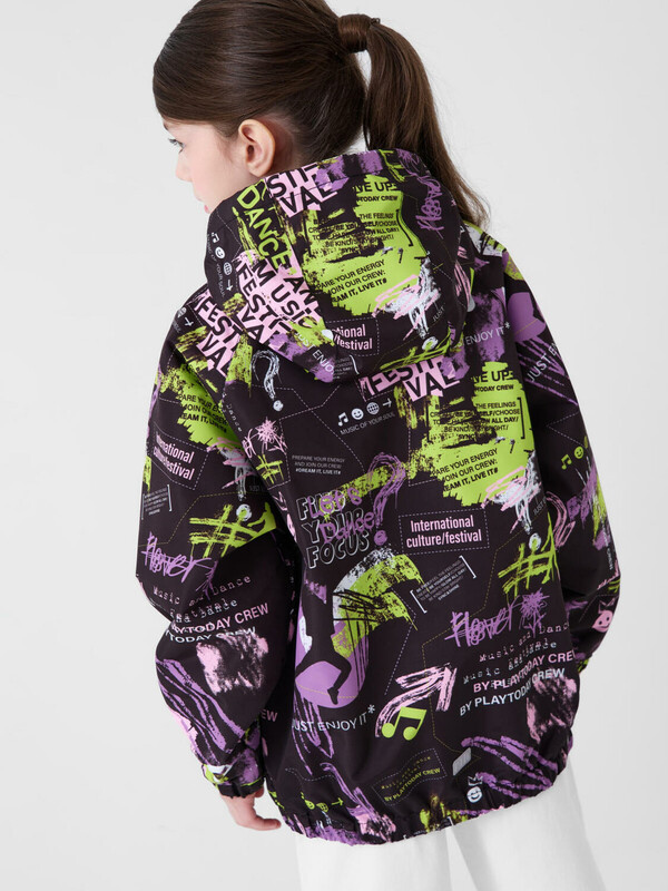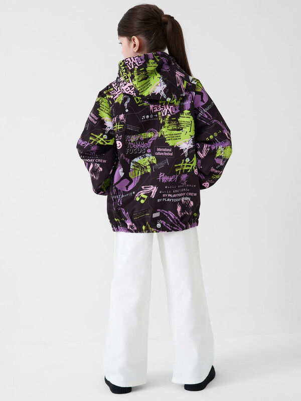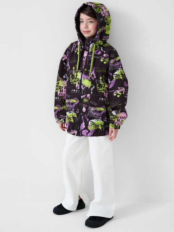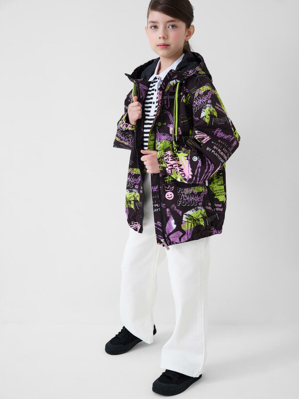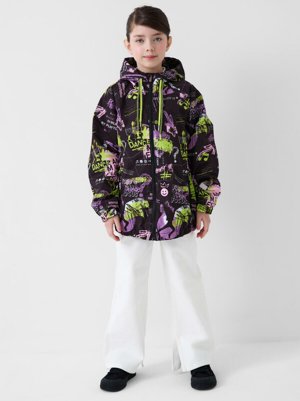 Cтильная ветровка для девочки подростка. Температурный режим от +20С до +10С. Ткань с мембранным покрытием 5000х5000. Внутри мягкая подкладка из трикотажа. Капюшон несъемный, регулируется шнуром. Два боковых кармана на молнии. Внутренний карман на липучке. Манжеты и низ изделия собраны на резинку. На спинке снизу — светоотражающая нашивка для безопасности в тёмное время суток.