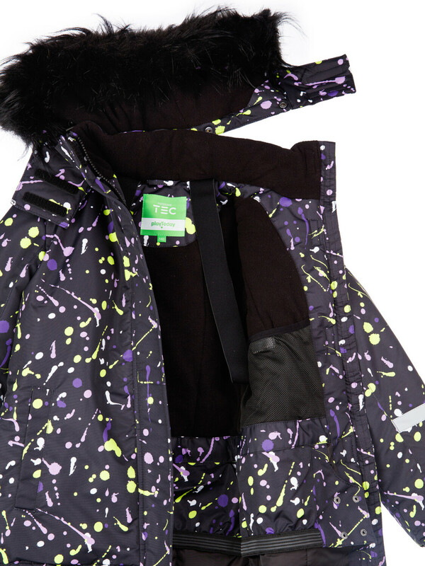 Мембранный материал делает этот яркий и модный комбинезон непромокаемым: мембрана не пропускает влагу снаружи, но выводит её изнутри, что крайне важно во время подвижных игр и занятий спортом.