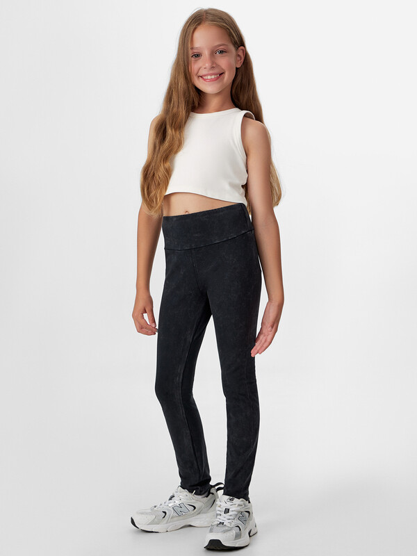 Обработка эйсид придает леггинсам стильный винтажный эффект – это специальная технология, которая создает мягкие потертости и неравномерный оттенок, добавляя образу индивидуальности. Такой дизайн понравится юным модницам, ценящим необычные детали.