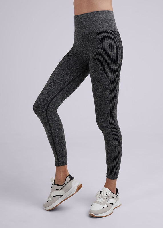Женские лосины с высокой посадкой. По талии широкая резинка, обеспечивающая комфортную посадку. По бокам декоротивные вставки в рубчик.