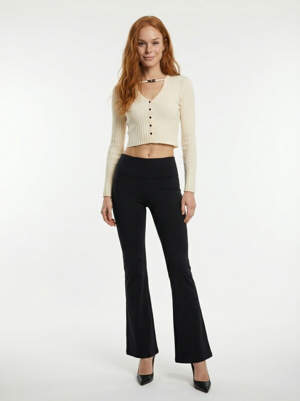 Расклешенный низ добавляет женственности и делает силуэт более сбалансированным. Модель легко комбинируется с укороченными топами, свитерами, рубашками и жакетами.