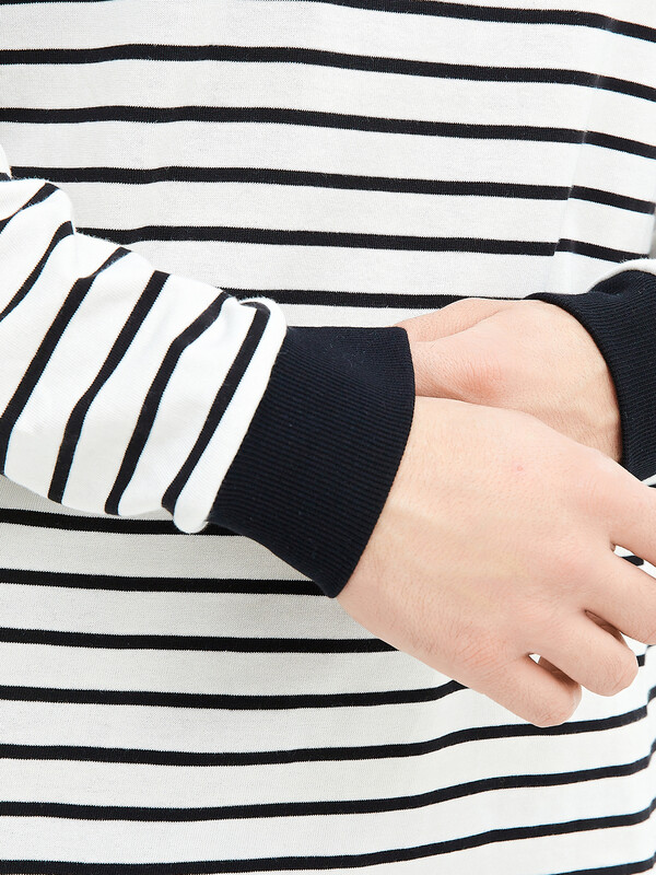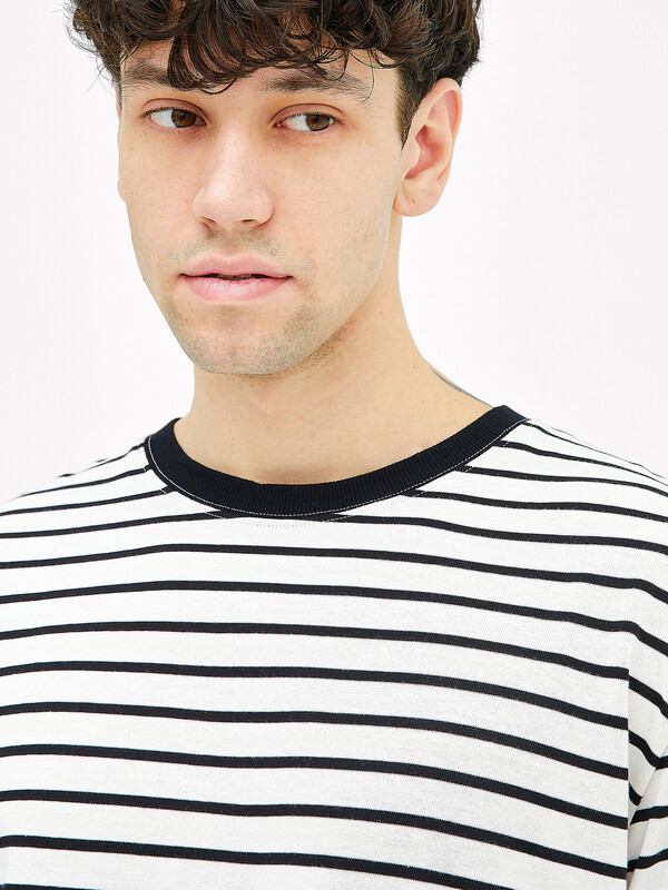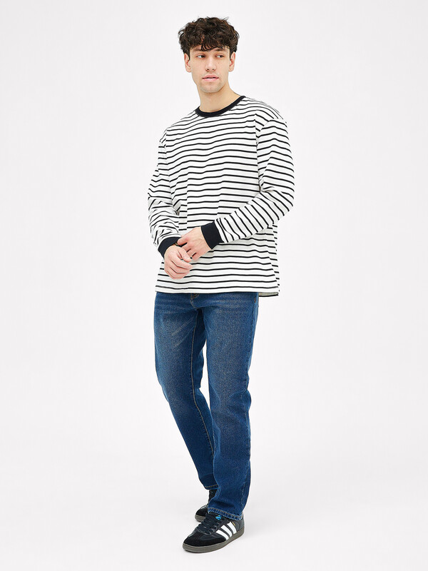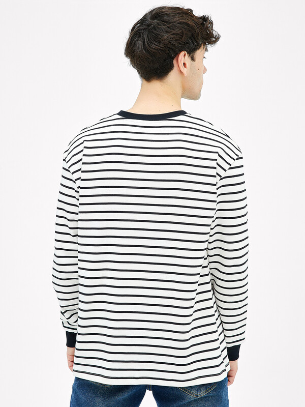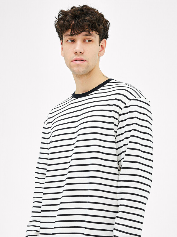 Стильный мужской лонгслив-тельняшка прямого, свободного силуэта, выполнен из высококачественного хлопка. Вырез круглый, классический, с контрастной окантовкой. Рукава длинные, свободные, с расширенными манжетами. Отличный универсальный лонгслив для casual-образов на каждый день. Дополнить такой лонг мужской в полоску легко и просто стильным низом. Его можно носить самостоятельно, как отдельный элемент или с другой верхней одеждой, создав при этом модный многослойный аутфит. Материал изделия износостойкий, мягкий и приятный к телу, не линяет и не выцветает при множественных стирках. Если вы в поиске базовой универсальной вещи, то этот лонг-тельняшка - отличный вариант!