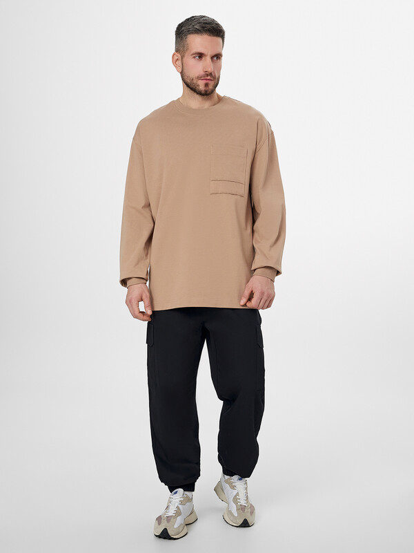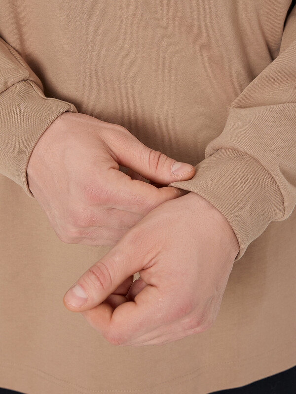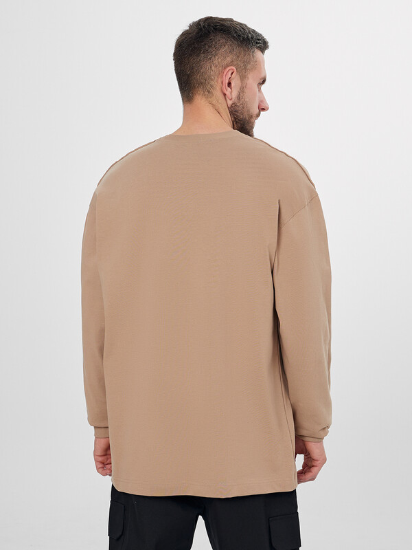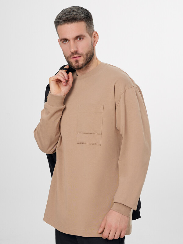 Рукав втачной, длинный, с отрезной манжетой из рибаны. Линия плеча слегка спущена. Лонгслив со швами наружу по линии плеча.