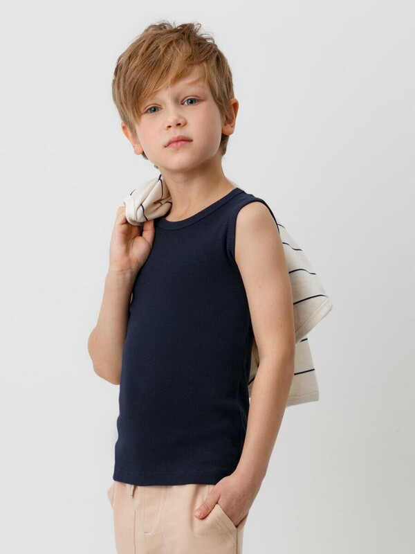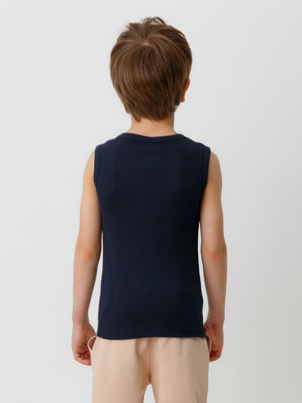 Лёгкая летняя майка в оттенке "индиго" для мальчика. Сшита из эластичного материала кашкорсе с добавлением эластана. Эластан в составе помогает изделию дольше сохранять опрятный вид и первоначальную форму.