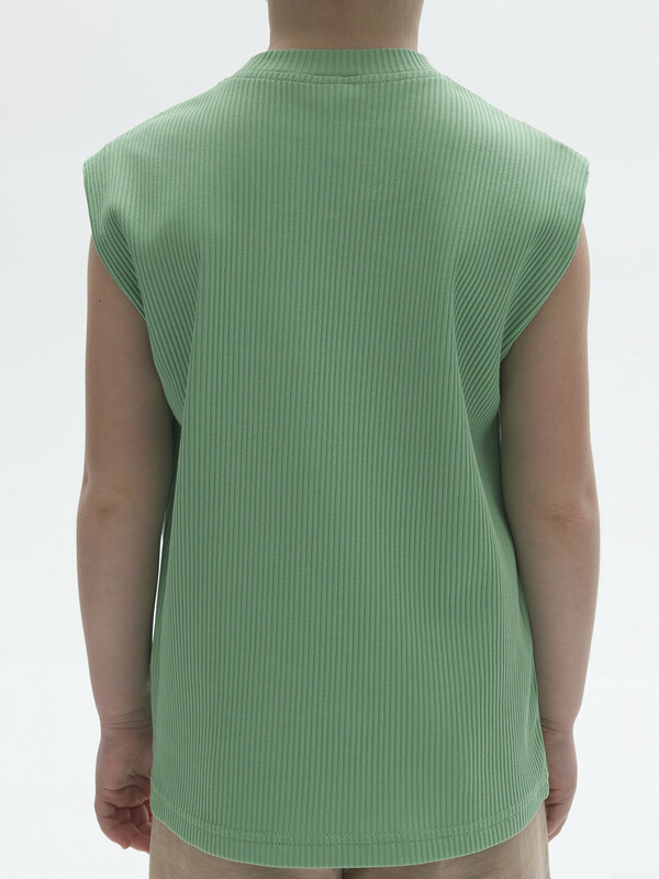 Удлинённая майка из модной ткани в рубчик для мальчика. В составе ткани преобладают хлопок и вискоза — изделие дышит, приятно на ощупь и комфортно для кожи ребёнка. Эластан помогает сохранять форму. Оригинальная обработка проймы: плечо немного удлинено, подогнуто внутрь и закреплено в плечевом и боковом швах — актуальный летний тренд. Майка прямого свободного силуэта не сковывает движений и подойдёт мальчикам с разной фигурой. Отличный выбор для летнего отдыха!