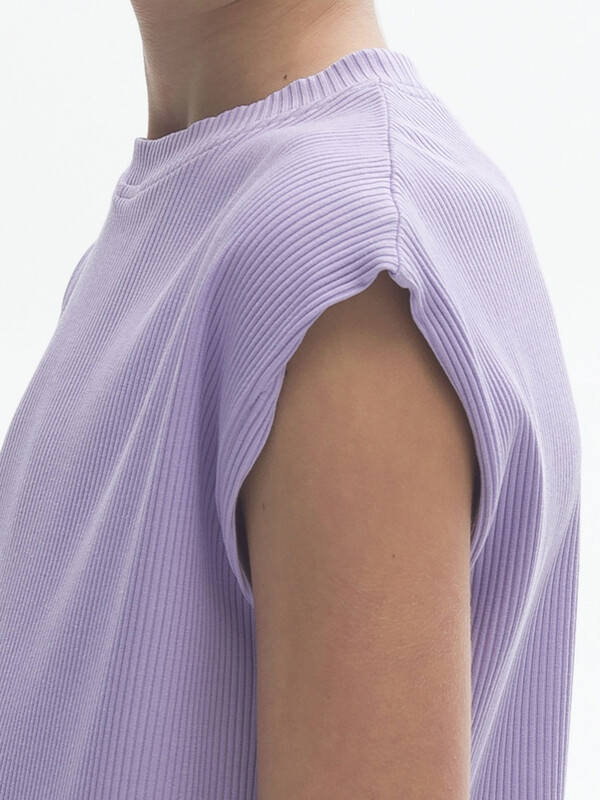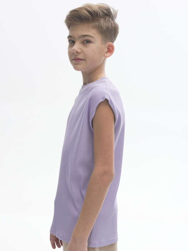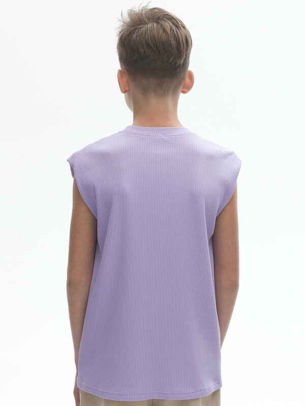 Удлинённая майка из модной ткани в рубчик для мальчика. В составе ткани преобладают хлопок и вискоза — изделие дышит, приятно на ощупь и комфортно для кожи ребёнка. Эластан помогает сохранять форму. Оригинальная обработка проймы: плечо немного удлинено, подогнуто внутрь и закреплено в плечевом и боковом швах — актуальный летний тренд. Майка прямого свободного силуэта не сковывает движений и подойдёт мальчикам с разной фигурой. Отличный выбор для летнего отдыха!