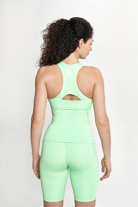 Майка спортивная с отрезной линией под грудью. Деталь лифа трохслойная с вставными чашками. Боковые фигурные рельефы по нижней части майки. Проймы, горловина и вырез спинки окантованы